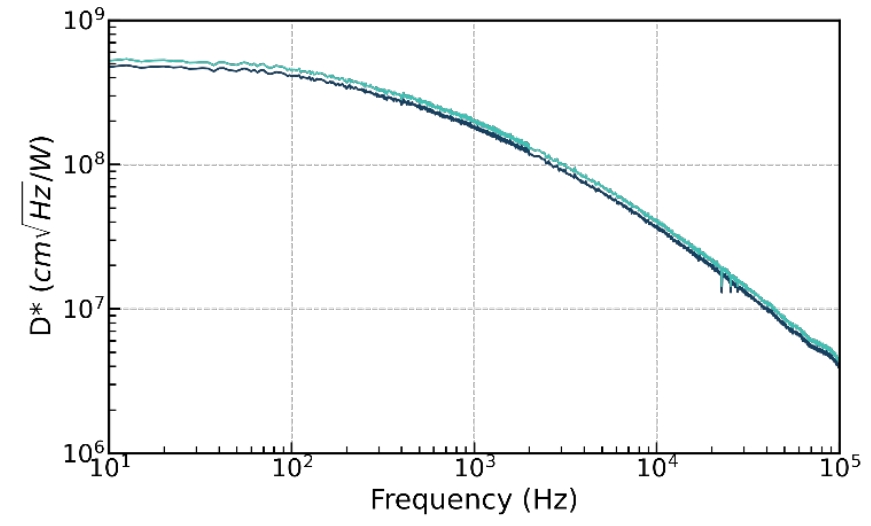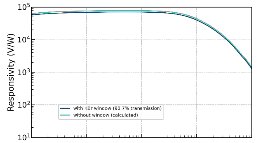 响应度和 D* 值是使用 6.8 μm 的 150°C 黑体发射器测量的峰值发射和带有 KBr 窗口的检测器。这些值可以更改为其他波长。