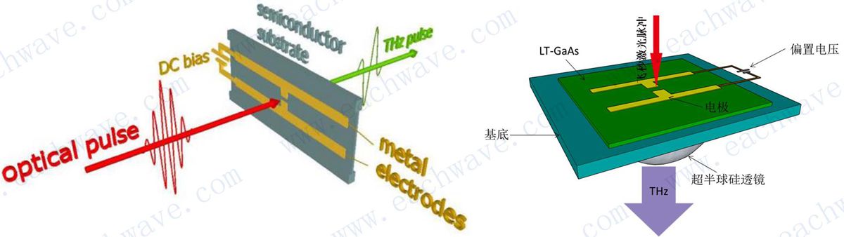 光电导天线是目前THz时域光谱仪中常用的THz产生与探测器件,生产工艺已经趋于成熟。上世纪 80 年代,太赫兹之父 D.Grischkowsky 等人利用光电导天线产生了 THz 辐射。这种方法发展到现在,已经成为一种较为普遍的实验方法。如下图,偶极天线结构被制作在低温生长的GaAs 上,利用光子能量大于 GaAs 禁带宽度的超短脉冲激发天线装置,是半导体内部产生电子-空穴对,这些载流子再外加电场的作用下将会加速运动形成一个瞬态电流,从而辐射出 THz 脉冲。