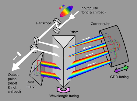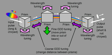 不幸的是,如果没有完全对准,脉冲压缩器可能会引入自己的失真:空间啁啾和脉冲前倾。我们发现大多数脉冲都受到这些畸变的影响。为什么?不幸的是,当脉冲波长被调谐或输入光束有一点漂移时,所有四个棱镜都必须旋转以精确地保持相同的入射角(粗粉色箭头)。但是你也需要根据你的脉冲的啁啾量来调整GDD。不幸的是,GDD的粗调和精调是分开的。粗调GDD(这是您真正需要的)需要改变前两个和后两个棱镜之间的间距,保持它们精确相等(粗紫色箭头)。如果任何棱镜具有不同的入射角,则输出脉冲将具有时空畸变。因此,粗调是不实际的。所能做的就是微调,这是通过将棱镜移入或移出光束(绿色箭头)来实现的。
