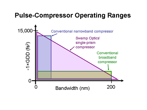 与传统脉冲压缩机相比下BOA压缩器的工作范围。注意,与传统的脉冲压缩器不同,传统的脉冲压缩器通过将棱镜移入和移出光束来调谐GDD,BOA可用于宽带和窄带脉冲。这是因为它通过移动角立方体来调整GDD,有效地改变了多棱镜设备棱镜之间的距离-这在标准设备上是不可能的。