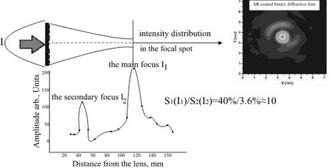 衍射透镜有两个焦距:一个主焦距,一个次焦距。主焦距I1/I的衍射效率是40%,次焦距I2/I的衍射效率<3.6%,这个已经在实验中得到了证明。