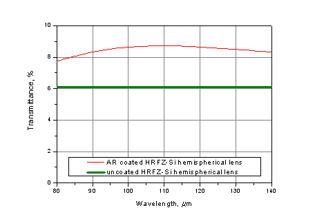 通常用在半球透镜上,平面不镀膜,该透镜通常用在THZ-TDS系统或者超导热辐射系统中光电导天线的THZ耦合中。99 um到125 um的高透膜一般是针对一些特殊应用的。高透膜可提高半球透镜30%透过率。测量半球透镜的透过率是很困难的,我们的透过率曲线是模拟出来的。