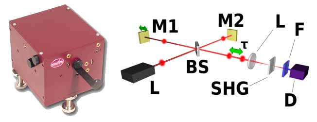 自相关仪主要被用来测量锁模激光器的超短脉冲宽度。利用光电探测的方法一般不能测量锁模激光器的脉冲宽度,光电探测器和示波器的最快响应时间约200fs,然而激光脉冲可以做到几个飞秒。自相关仪一般利用到的光学非线性效应有:二次谐波产生(SHG)、双光子吸收(TPA)、以及更高阶的非线性效应。迈克尔逊自相关仪,将激光的时间量变成空间量,即将时间的测量变成对长度的测量。将脉冲激光用50/50的分光片分成两束,利用镜片组在一束光里引入延迟,然后将两束光合并,让一束激光对另外一束光进行扫描,使得合并后的激光通过非线性晶体产生非线性效应,或者直接采用双光子吸收测量,再由示波器进行接收,这样就可以得到激光脉冲的脉宽信息。