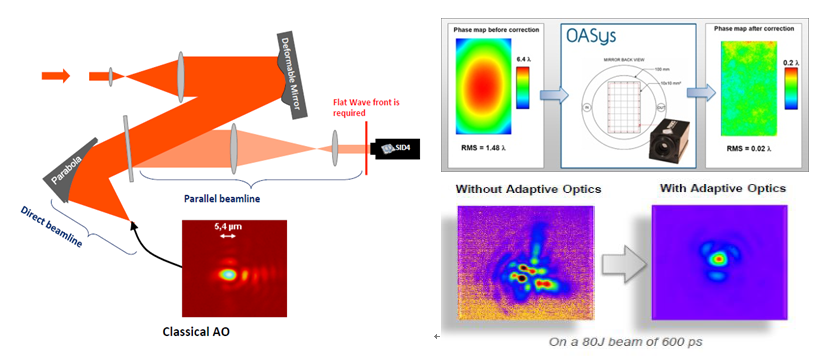 利用Phasics波前传感器检测到精确的波前畸变信息,反馈给波前校正系统以补偿待测波前的畸变,从而得到目标波前相位分布和光束形状。右图上为把一束RMS=1.48λ的会聚光矫正为RMS=0.02λ的准平面波;右图下为把分散焦点光斑矫正为准高斯光束。高频率大气湍流自适应需要配合高频波前分析仪。
