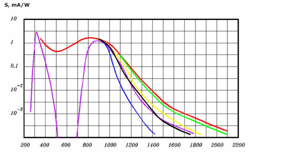 紫色—UV/IR viewer Abris-M 红色—IR viewer Abris-M 2000 绿色—IR viewer SM-3R 2000 黄色—IR viewer Abris-M 1700, hybrid-intensified camera CONTOUR 黑色—IR viewer SM-3R 1700 蓝色—IR viewer Abris-M 1300