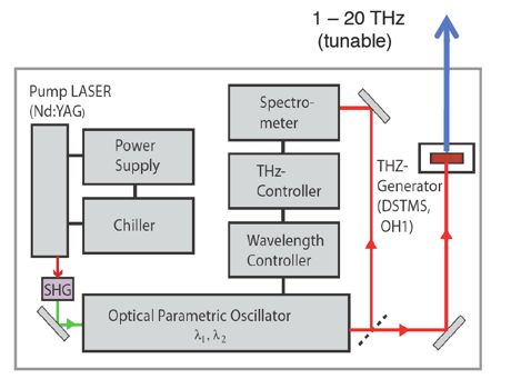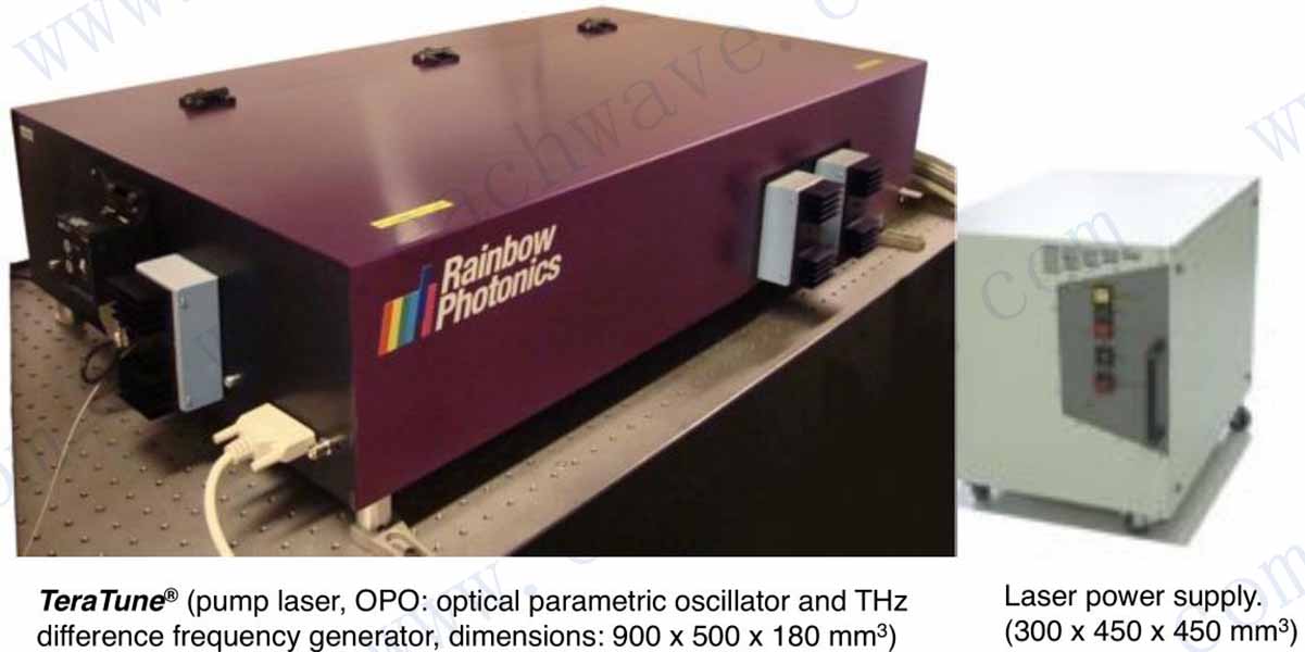 TeraTune可以输出带宽小于100 GHz的窄带THz波,可调谐范围从1.5 THz到20 THz。TeraTune是基于闪光灯泵浦激光器(重频50 Hz到200 Hz)配备专用的光参量振荡器(OPO),其中一个波长利用电子设备调谐经过特殊设计来保持带宽小于100 GHz。可以提供其它二极管泵浦激光系统。可变波长是经过校准的,不同THz频率可以通过电脑控制(可调谐范围1-20THz)。THz辐射是基于在DSTMS有机非线性晶体上的混频效应产生。