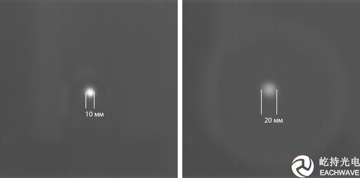 上图展示了太赫兹光束扩束器的应用案例。太赫兹辐射来自于一个铁氧环流器,波长3mm(100GHz),接收器是一个来自于INO公司的太赫兹相机MICROXCAM-384I-THZ。太赫兹相机上的镜头是TYDEX生产的(f/0.7型相机镜头)。太赫兹源辐射出直径为10mm的平行太赫兹光斑(光斑直径在1/e2测量),左下图相机记录了没有太赫兹光束扩束器时的光斑尺寸,右下图则记录了放入×2倍扩束器在光路中时的结果。可以明显看出来×2倍的太赫兹光束扩束器将平行的太赫兹光束直径变大了2倍。