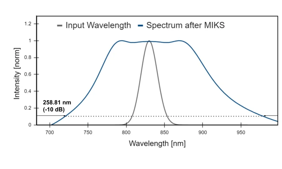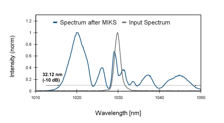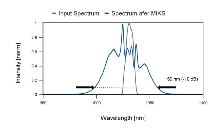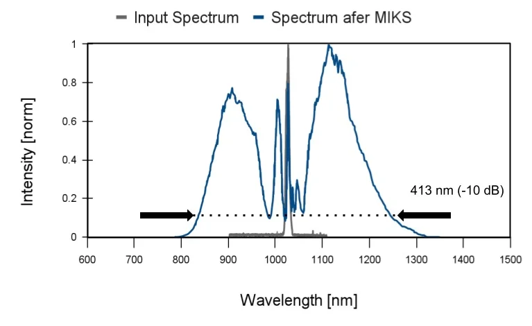 在这里,我们展示了由Monaco飞秒激光器泵浦驱动MIKS1_S 模块的性能。峰值功率可提高 6 倍,效率超过 95%。自相位调制频谱和脉冲压缩如下图所示。