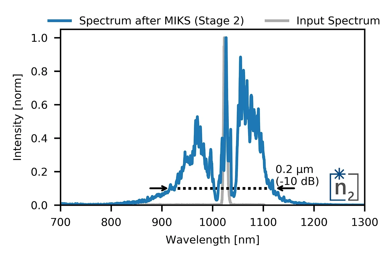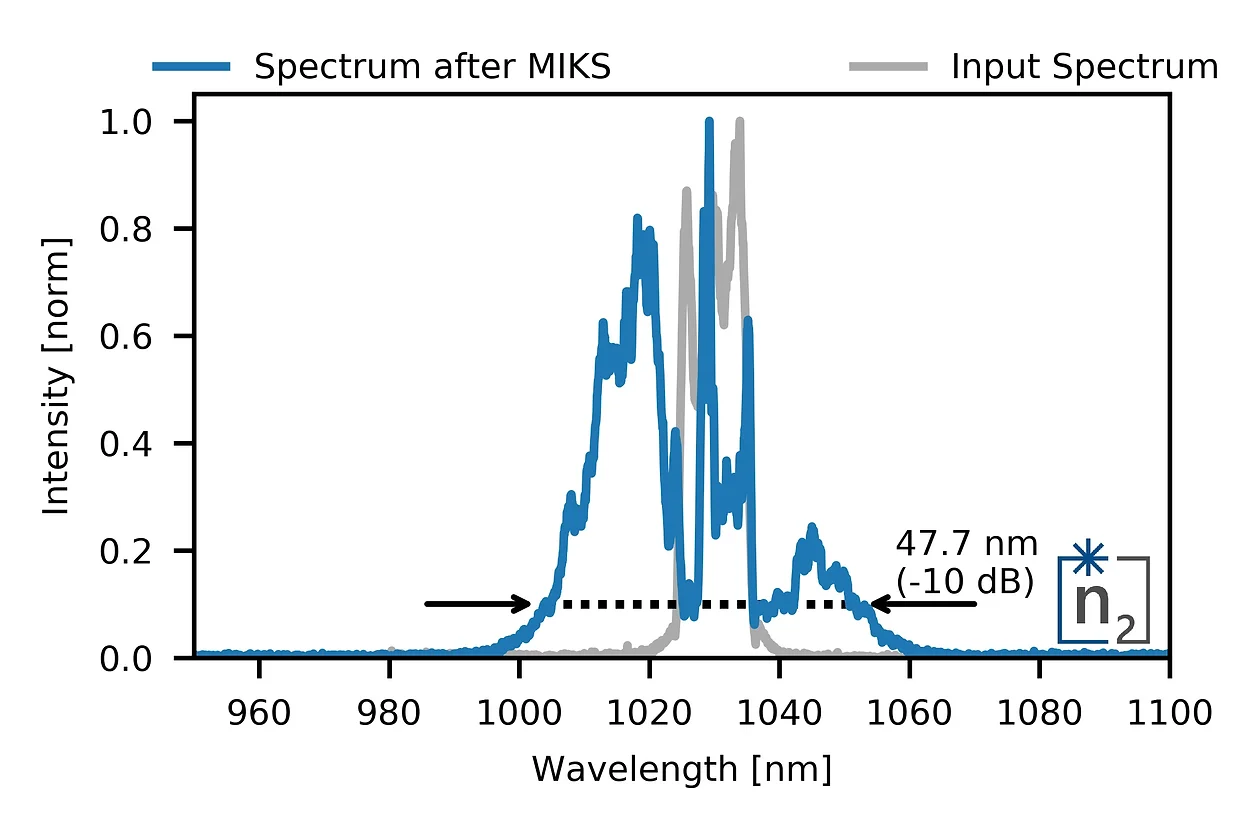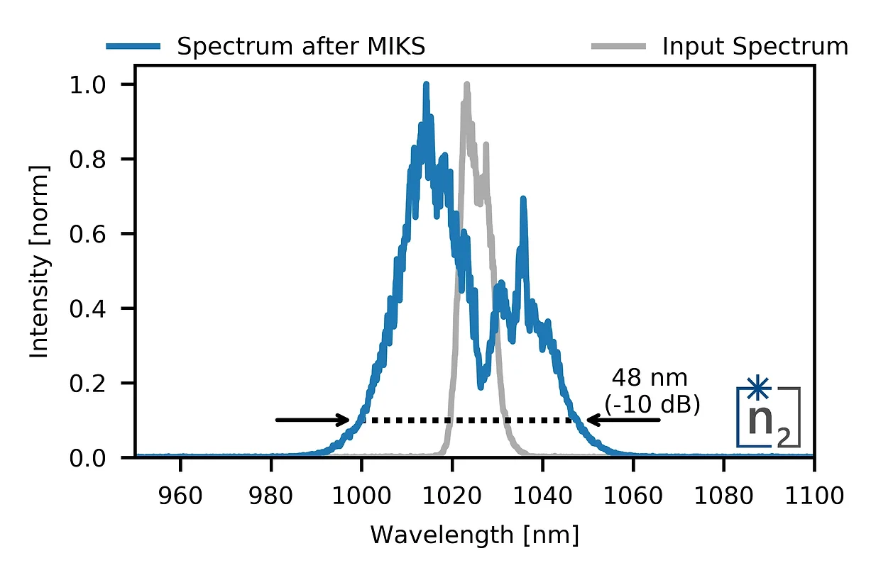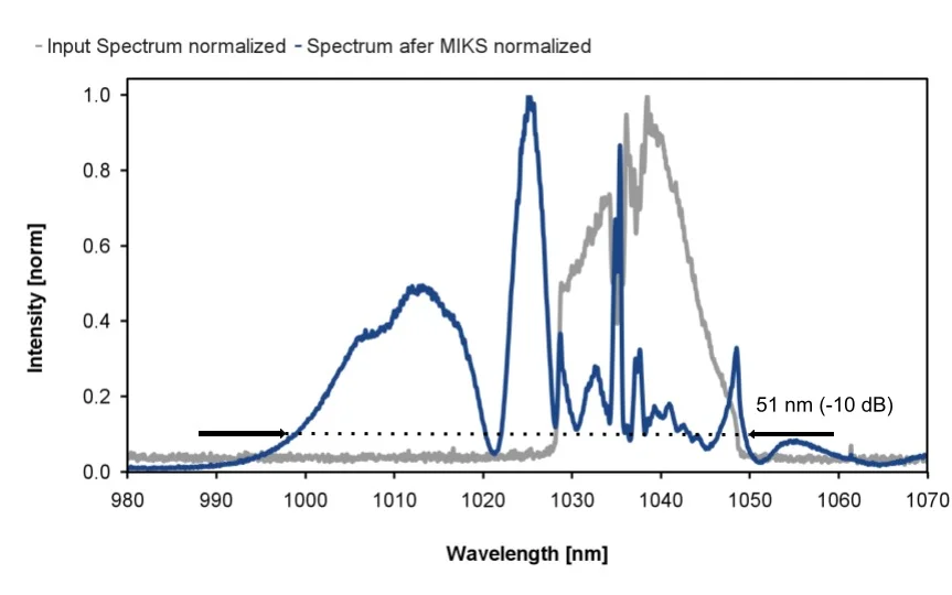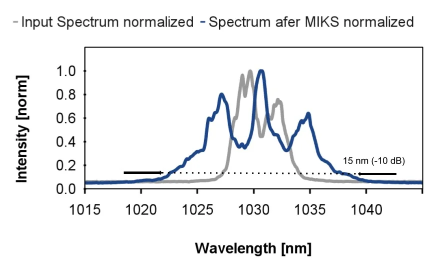 在这里,我们展示了由硬质合金飞秒激光器泵浦驱动 MIKS1_S 模块的性能。峰值功率可增加 4 倍,效率可达 95%。自相位调制频谱和脉冲压缩如下图所示。