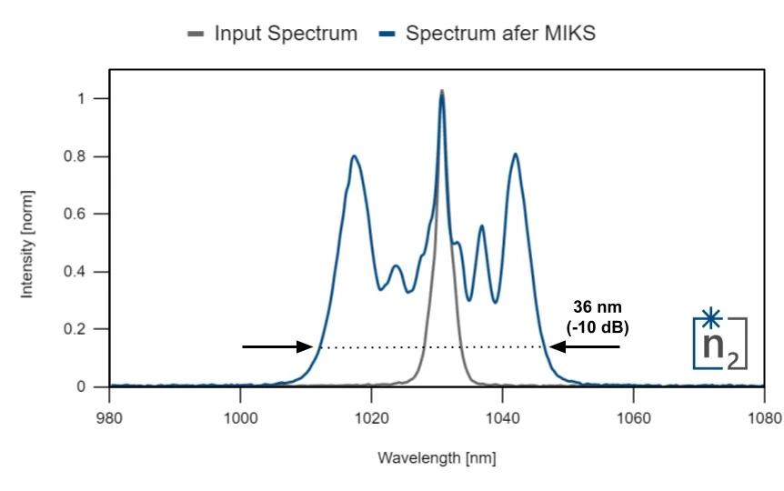 在这里,我们展示了由 neoLASE neoMOS SMAARTlaser 飞秒激光器泵浦驱动MIKS1_S 模块的性能。峰值功率可提高七倍,效率超过 90%。自相位调制频谱和脉冲压缩如下图所示。