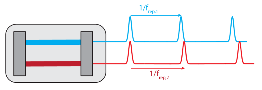 单腔双梳激光器的脉冲结构示意。两个脉冲序列以不同的重复率发射: frep1 和 frep2。两个输出在空间上是分开的。