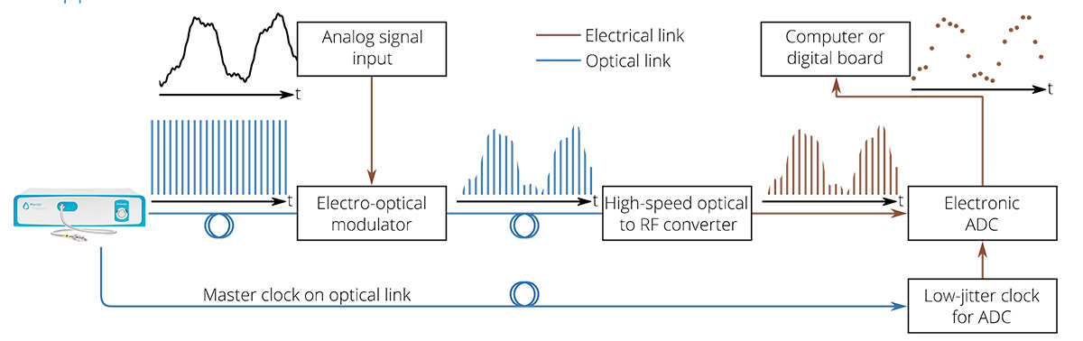 数据数字化为电信、雷达和信号处理带来了前所未有的机遇。目前使用的几乎所有传感系统都需要将模拟信号转换为数字信号。信号速率的增长速度已经超过了电子模数转换(ADC)。对更高带宽、速度或数字化精度的需求对ADC设置的孔径抖动提出了严格的要求。改善ADC的一种方法是使用光子解决方案提供的时序抖动较低的时钟源。光子ADC不仅受益于改进的时序抖动。使用像 MENHIR-1550 激光器这样的锁模激光源可实现各种新的超快速光子数字化技术。