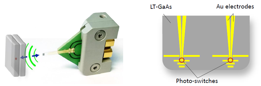 ? TR.5收发太赫兹探针配备了两个光电导开关,而不是一个。使用两根TS电缆进行电气连接,并使用两束飞秒激光光束进行光学激发。发射器和检测器可互换。选择其中一个作为太赫兹检测器,另一个作为太赫兹发射器。