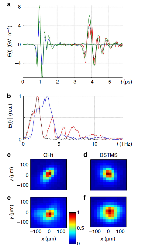 对于我们的THz光源,我们使用一个脉冲持续时间为65 fs的光学参量放大器(OPA)系统,在1.5μm和1.35 μm波长下泵浦小型有机晶体DSTMS和OH1(详见方法)。在该方案中,在THz发射有机晶体位置泵浦通量保持恒定,采用全反射式望远镜组件调整泵浦光束的球面波前曲率。有机晶体极好地适合于太赫兹为他们提供相位匹配太赫兹在1-5 THz范围(没有无机晶体被证明高效的),一个非常高的二阶非线性光学敏感性和240 pmV-1和高损伤阈值(见方法部分更多的细节)。