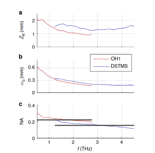 评价光束质量参数M2需要围绕焦点的三维光束轮廓。由于太赫兹辐射覆盖了几个倍频程,频谱被添加为第四维。我们用EOS探测方法对光束沿焦点的传播方向进行了时域光谱分析。然后,我们通过相应的轴向光束强度的降低来评估zR(图4a)。由此,我们得到光斑大小(图4b)和有效数值孔径(NA;图4 c)。该技术不考虑探测器的影响,采用高度对称的高斯光束。在我们的例子中,它高估了zR,因为整体的大探头尺寸几乎是沿着扫描光束腰平行的。我们实验估计的有效NA与假设一个高质量的衍射限制(M2=1)束计算的NA相比对。良好的匹配表明,我们的光束有M2≈1,但与频率有轻微的关系,这是由最小但不可避免的散度以及光泵浦和产生晶体的缺陷造成的。