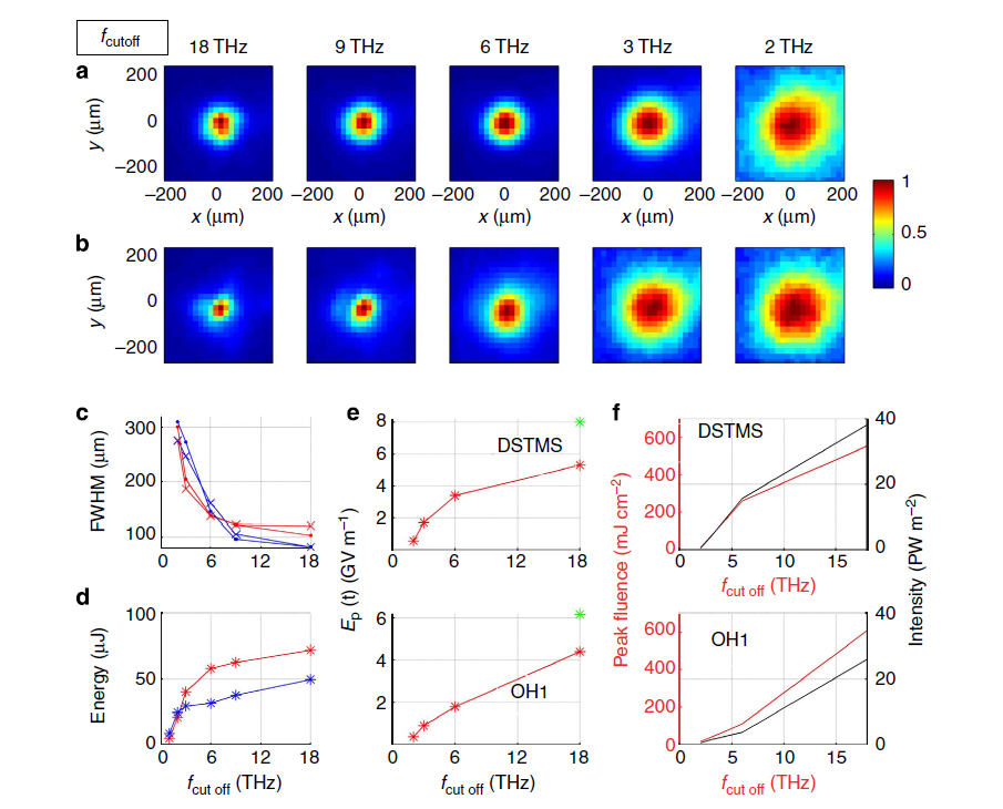 图 5 光斑尺寸和场强度表征:对于不同的截止频率{2,3,6,9,18}THz (a) DSTMS (b) OH1 (2,3,6,9,18} THz),聚焦处的归一化THz点显示出来。(c)在不同的截止频率下,从a和b中提取的THz光斑尺寸为全宽-半最大值。红色和蓝色分别为DSTMS和OH1。点和交叉标记表示x和y方向。DSTMS(红色)和OH1(蓝色)对应的能量。(e) THz峰电场。(f)测得的峰通量和峰强度。在e中,绿色星号表示的估计场时,聚焦镜没有探针孔被使用。除此之外,所有的测量都是用一个带洞的聚焦镜进行的。
