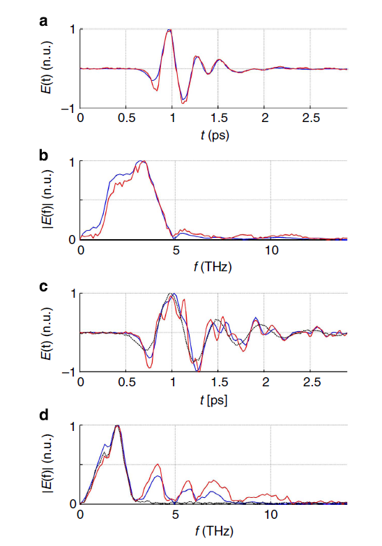 图7 太赫兹探测方案。DSTMS (a,b)测得的太赫兹与OH1 (c,d)的比较。蓝色曲线显示了使用EOS的测量结果。空气偏置相干探测测量用红色表示。对于OH1,用ABCD过滤掉较高频率(>3 THz)分量后再进行测量(黑色)。