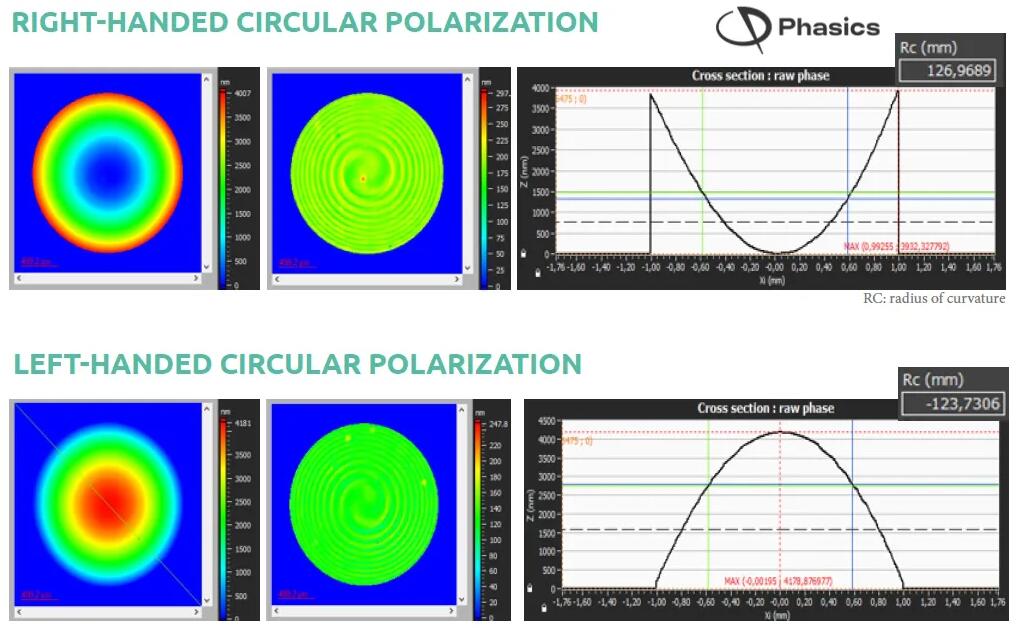 Phasics的QWLSI技术不会受到偏振的影响,因此在从右旋圆偏振切换到左旋圆偏振时,我们的设备仍然可以对波前进行详细表征。图2展示了波前曲率的变化。此外,可以通过滤掉主要的波前曲率来揭示残余波前误差,这些误差反映了更高空间频率的缺陷(见图2中间的左侧相位图)。