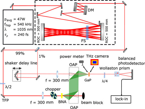 在这篇文献中,我们演示了一种室温下基于共线或有机晶体BNA(瑞士太赫兹股份有限公司)的THz TDS,由商业激光系统驱动,平均功率高达47 W,重复频率为540 kHz。使用自制的Herriott型多通盒(MPC)压缩器将来自驱动激光器的脉冲从240 fs压缩到45 fs。采用4.7 W的驱动功率,占空比为50%,在75 dB的高动态范围内,获得了5.6 mW的THz平均功率,带宽可达7.5 THz,转换效率为0.12%,将参考文献中报告的最新技术改进了5倍以上,并提高了一个数量级的转换效率。此外,它是第一个有机晶体为基础的源操作在吸引数百千赫重复频率制度。