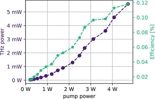 在不考虑热效应的情况下,效率的第一个基本限制是非线性转换过程本身。非线性光学过程(如光学整流)的Manley–Rowe关系表明,一个THz光子是通过一个泵浦光的湮灭产生的,因此,发射的THz光子不能超过泵浦光的光子数。在我们的例子中,假设中心THz频率约为2.5 THz(10.3 meV),由于THz光子能量比1μm(1.2 eV)处的NIR光子能量小约两个数量级,因此预期最大能量转换效率为1%。通过级联可以获得更高的转换效率,但很难估计该过程的效率,因为它强烈依赖于泵浦脉冲的线性和非线性脉冲传播以及新红移光子和产生的THz光的相位匹配特性—所有这些值都需要这些晶体未知的材料特性。然而,从我们以前的工作中我们知道,在高重复频率下,热效应是限制标度效率的主要因素。为了避免这种情况,需要低占空比泵浦斩波,以使泵浦脉冲群的关断时间与晶体的弛豫时间大致匹配,而较短的脉冲群有助于达到整体较低的温度。在本实验中,我们只提供了一个占空比为50%的斩波轮;我们可以期望通过使用占空比为10%的斩波轮和输入端相应的更高功率激光器,更接近理论极限并接近百分比水平。我们注意到,在这个实验中,我们只使用了可用泵浦功率的20%;因此,降低斩波占空比将是改进结果的直接途径。