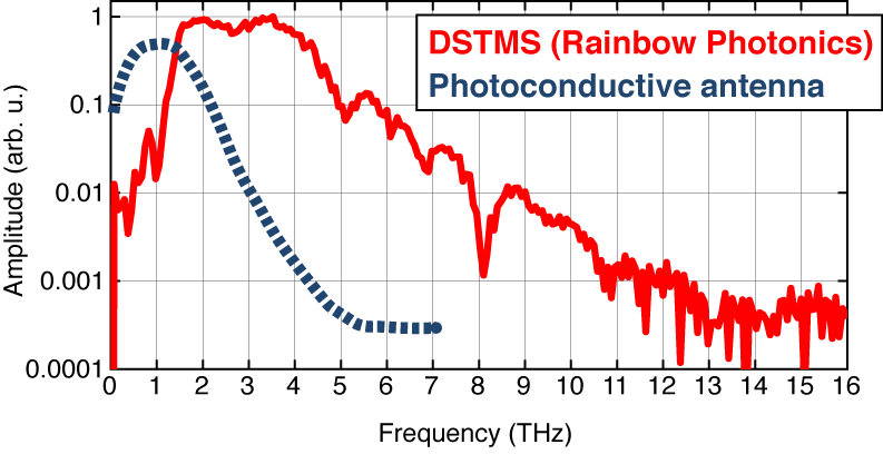 在有机晶体DSTMS (TeraSys?- ULTRA)中使用飞秒泵浦激光器和THz时域光谱学产生的THz脉冲的频率函数和典型的PC天线范围内的THz场振幅。