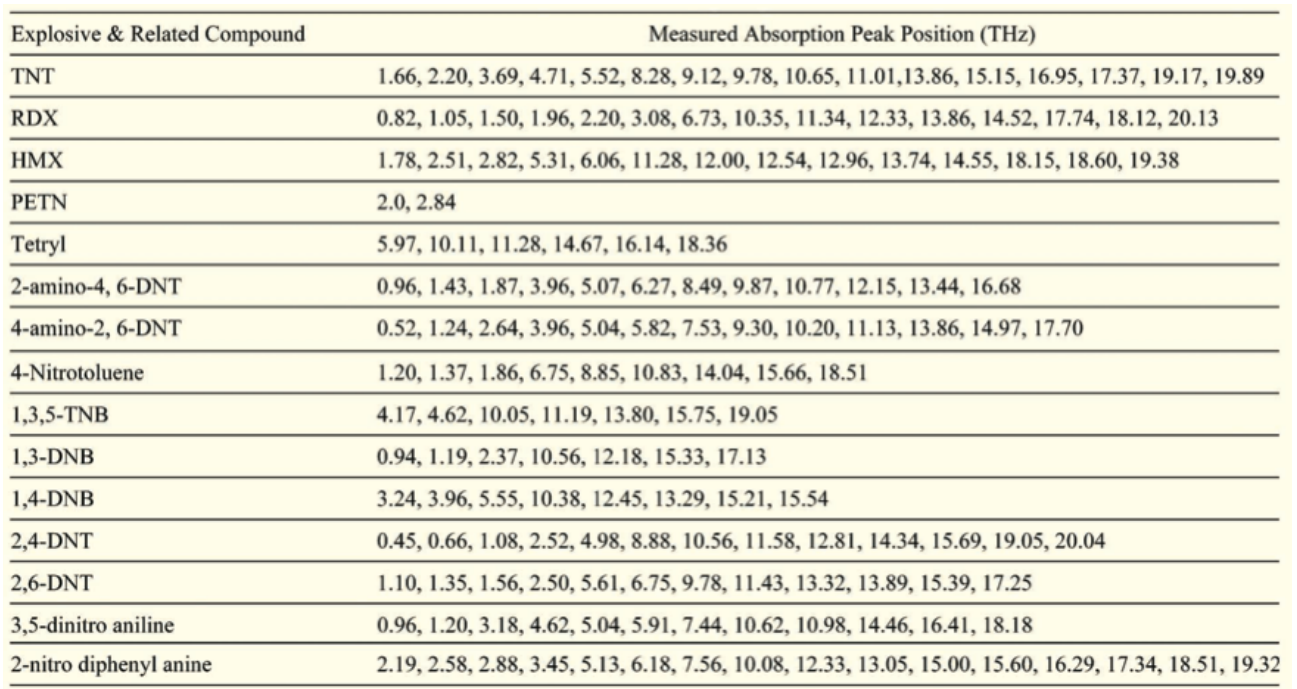 (a) 显示了使用THz时域光谱测量的几种爆炸物的THz光谱。