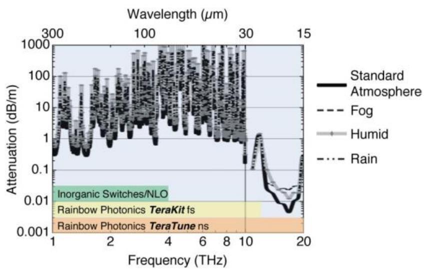空气中THz辐射的衰【来自Appleby等人,IEEE 2007】。在10 THz以上,空气中的衰减明显小于10 THz以下。这开辟了广泛的新应用可能性,如远程成像和遥感。
