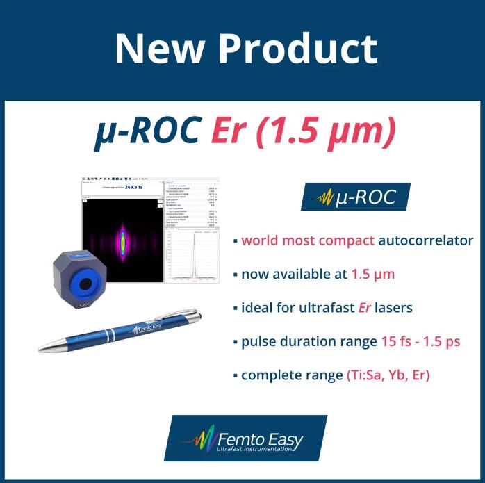 Femto Easy μ-ROC 单次自相关仪采用极其紧凑和坚固的设计理念,突破了ROC原理极限,其体积和高尔夫球一般大小,能够在前所未有的紧凑型自相关器内测量单次自相关轨迹。μ-ROC 是基于 Femto Easy 最新的专利设计开发而成,并借鉴了多年来在单次超快仪器方面积累的丰富专业知识,为单次自相关仪性能树立了新标准,可轻松测量飞秒脉冲或者OEM 集成到激光系统中。