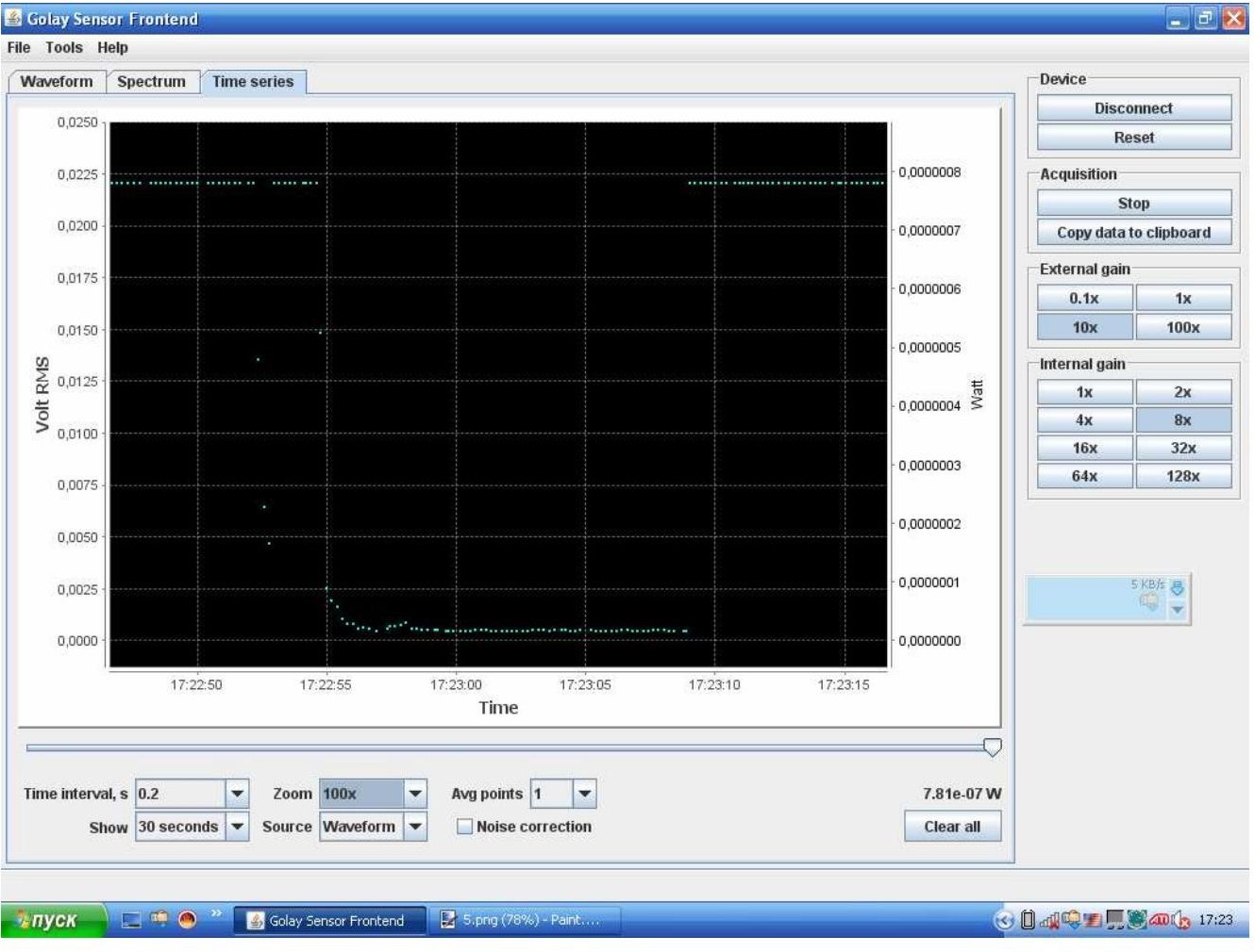 此选项卡中的图表表示电压和 Golay cell吸收的相应能量对时间的依赖性。横轴是时间(即根据PC内部时钟的一天中的时间),纵轴是使用电压/能量比值计算的RMS电压和吸收能量。