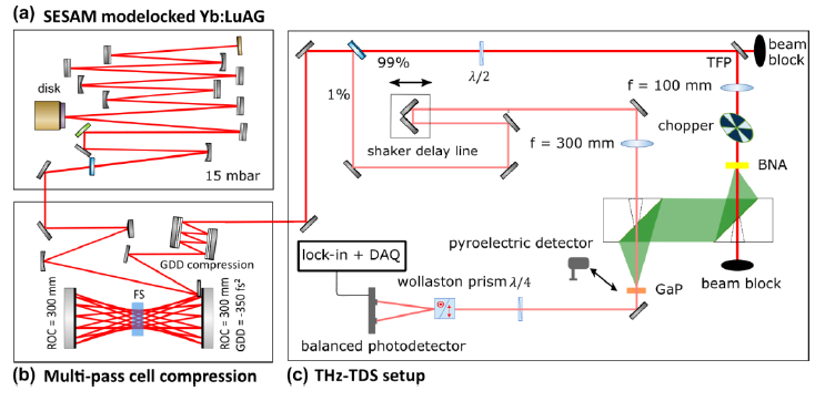 在各种技术适合生成所需的宽带,TDS相位稳定的太赫兹脉冲,光整流或超短脉冲在非线性晶体是最常用的之一,和各种各样的材料一直在探索提高太赫兹源性能。在过去的几年里,人们对使用现代基于掺镱的高功率驱动超快激光器为TDS产生高重复率、高平均功率太赫兹脉冲产生产生了极大的兴趣,以提高信噪比和/或测量时间。在这方面,磷化镓(GaP)是一个受欢迎的选择,因为它提供宽带操作(通常超过6 THz)和速度匹配在一个简单的共线方案为1030 nm,现代基于Yb驱动激光器通常操作。在各种日益可用的新型高平均功率激光系统中,我们将注意力集中在锁模薄盘振荡器上,因为它们在高平均功率下提供MHz重复频率的脉冲,直接从一个与复杂多链放大器[输出功率水平相似的单箱振荡器。利用这种技术,我们最近在112 W激光系统的激发下,利用GaP中的共线OR演示了毫瓦平均功率太赫兹水平,带宽可达6太赫兹。然而,即使在这种中等脉冲能量状态下,这些半导体材料也存在固有的中等非线性系数和1 μm抽运时的双光子吸收,这限制了转换效率到典型值<10-5。为了克服这些限制,铌酸锂(LiNbO3)通常采用倾斜脉冲前技术,但代价是设置的简单性。使用这种技术,平均功率在100 mW范围最近已经实现。然而,由于铌酸锂对声子的吸收,发射的太赫兹光谱带宽被限制在低于2THz的频率范围内,最近的研究表明,当使用μJ泵浦脉冲能量在MHz重复频率下时,转换效率受到限制.