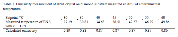 为了研究BNA中太赫兹产生的热行为,我们在所有实验中使用红外摄像机(InfraTec, VarioCam HD)测量了BNA晶体的温度。为了获得准确的温度测量,我们首先表征了BNA晶体的发射率。在这个目标中,晶体被放置在底部有哑光黑色铝表面的热板上。热板的温度在30℃到60℃之间变化5℃,在每一点,晶体的温度以及作为参考的黑色表面的温度是由观察BNA表面的摄像机测量的。考虑环境温度为20℃时,计算得到各温度下的发射率如表1所示。在上述温度范围内,在20度角度下,BNA的平均发射率值为0.87,我们在接下来的章节中使用这个值来估算晶体的真实温度。