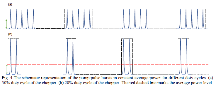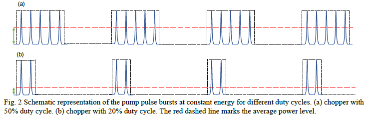 在本节中,通过改变斩波器的占空比,使泵浦脉冲能量在晶体上保持恒定,并改变泵浦平均功率。在每个占空比为10% ~ 50%时,会产生不同持续时间的泵浦脉冲,导致斩波后晶体的平均功率不同。当占空比从50%降低到10%时,有效重复频率(每秒脉冲数)从6.7 MHz到1.3 MHz不等。需要指出的是,为了使晶体上的脉冲能量保持恒定,在占空比变化过程中,斩波前的波片保持固定的旋转角度。当占空比从10%增加到50%时,晶体的脉冲能量为0.14 μJ,而平均功率从0.18 W增加到0.9 W。图2显示了通过改变占空比,在恒定的脉冲能量和可变的平均功率(红色虚线)下泵浦脉冲爆发的示意图。占空比为50%和20%的脉冲分别如图2a和图2b所示。红色虚线表示通过减少占空比而降低的相对平均功率,尽管通过改变占空比,每个单个脉冲的振幅(与脉冲能量成正比)是恒定的。
