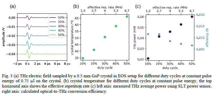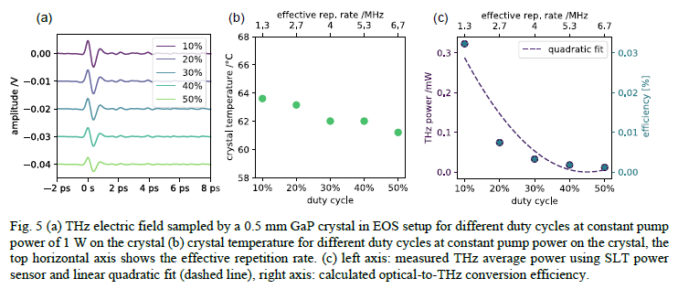 为了研究脉冲能量变化对发射太赫兹功率和转换效率的影响,采用功率传感器代替探测晶体。图5c显示了测量的太赫兹功率与占空比。正如预期的那样,THz平均功率通过降低占空比二次方增加,这对应于更高的晶体泵浦脉冲能量(图5c)。这种对占空比/脉冲能量的二次方关系可以用于低能量状态下的OR(这是一个二阶脉冲内差频率产生过程),类似于报道的GaP和铌酸锂结果。这证实了3.1节中的饱和效应仅仅是由于泵浦功率而不是脉冲能量,说明了在这个高平均功率、高重复率的状态下,主要的限制效应是热效应。这预示着未来将通过进一步改进冷却系统来改进安装,例如主动冷却系统。这也应该允许应用全脉冲序列,而不需要减少激光的占空比。然而,值得强调的是,限制转换效率并导致更高平均功率损害的确切物理机制需要更详细、独立的调查。