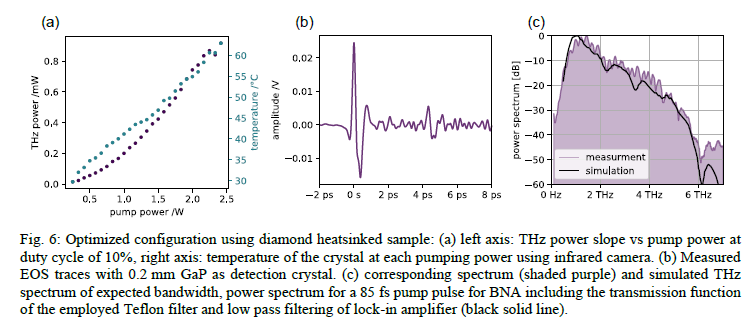 在不久的将来,我们计划将我们的压缩设置优化到10 fs以下的脉冲持续时间,这将使得有更宽的带宽和更高的效率,因为可以在不增加热负荷的情况下应用更高的峰值功率。此外,为了有效的热控制,主动冷却晶体将允许我们进一步扩大泵浦功率并减少太赫兹吸收。我们相信,这可以使这个来源很好地进入数10mW的状态。此外,这将使我们能够继续研究BNA中的温度依赖性效应。
