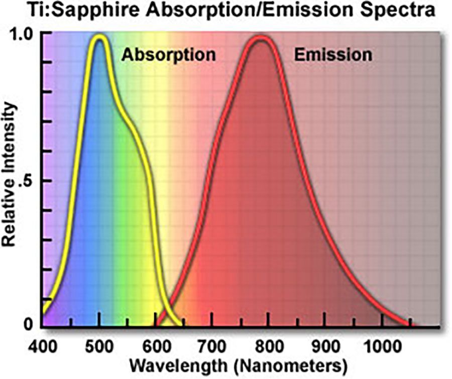 掺钛蓝宝石(Ti:sapphire)是一种固态激光介质,能够在较宽的近红外(NIR)波长范围内进行可调谐激光操作。由于在光谱的蓝色和绿色区域具有宽的吸收带,激光过程中的能量可由标准连续波氩离子激光器或532nm高功率二极管泵浦连续固体激光器提供。 通过选择合适的光学器件,锁模钛宝石激光器可以覆盖690nm-1080nm的波长范围,脉冲宽度小于10fs。